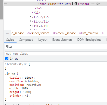 .ir_wa 클래스를 해제해본 결과 => 뒤에 있던 텍스트들이 모습을 드러내었다. +) 네이버 홈페이지의 IR 사용